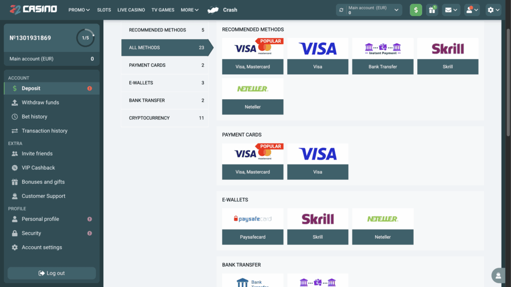 22Casino podpira različne načine plačila, vključno s kreditnimi karticami, e-denarnicami, kriptovalutami in bančnim nakazilom. Najhitrejša izplačila potekajo prek e-denarnic in kriptovalut, medtem ko lahko bančna nakazila trajajo nekoliko dlje. Igralnica za transakcije ne zaračunava nobenih pristojbin.