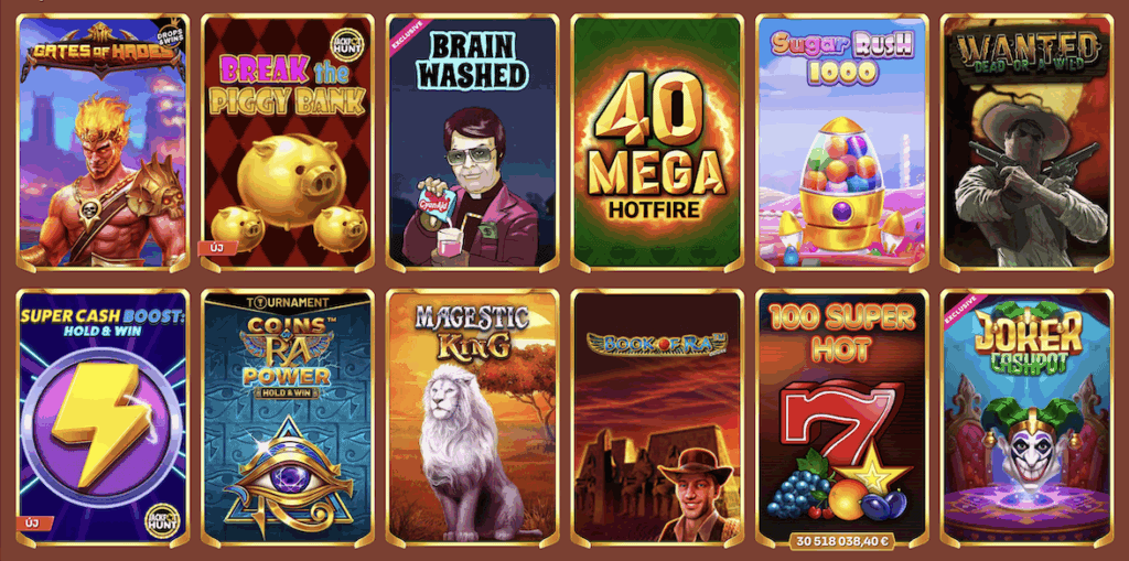 Na voljo so tudi Megaways igre, vključno z uspešnicami, kot so The Dog House Megaways, Divine Fortune Megaways in Great Rhino Megaways, ki ponujajo dinamične načine za zmago. Igre so pregledno razvrščene po kategorijah, kar omogoča enostavno iskanje priljubljenih tem, kot so sadni avtomati, “book” avtomati in klasične reže.