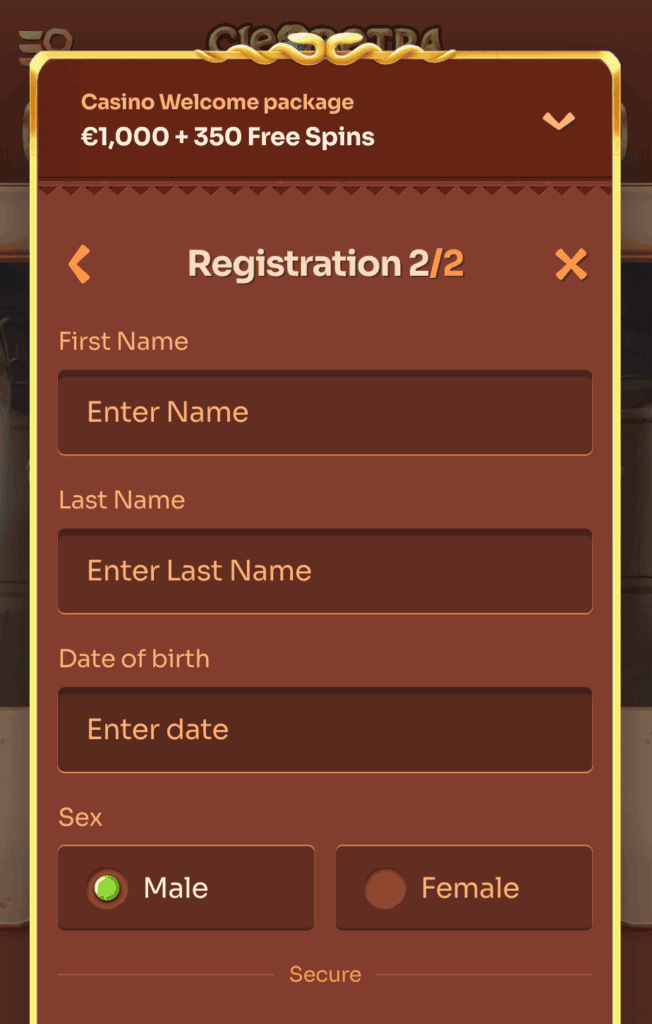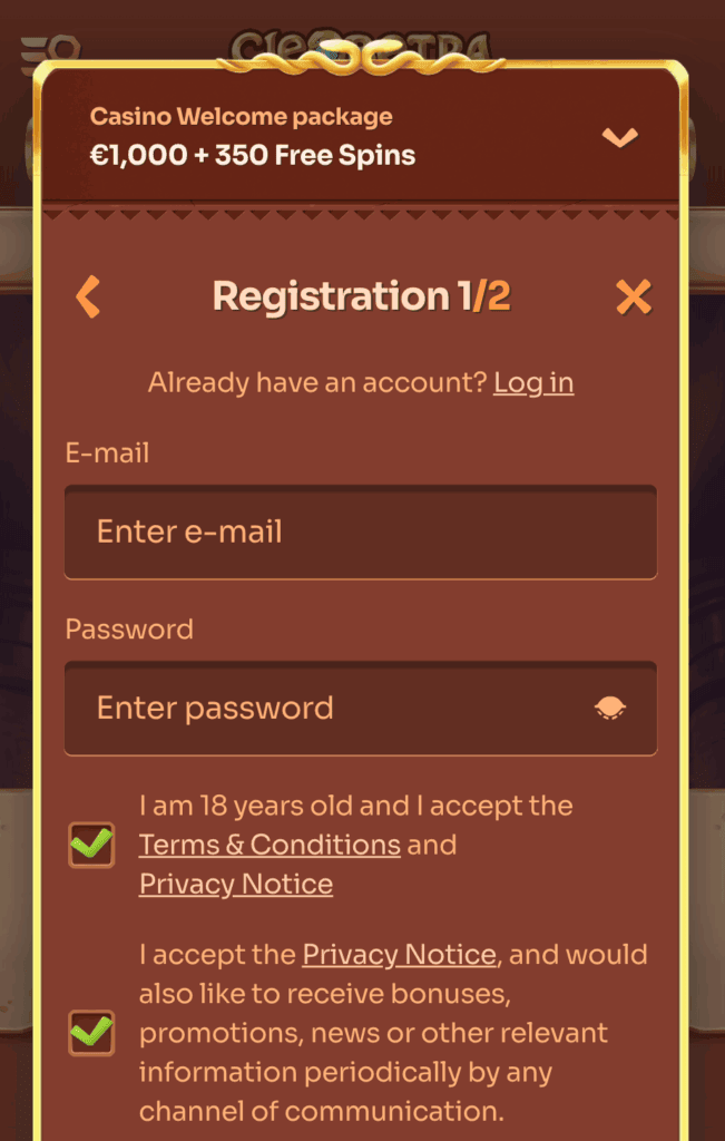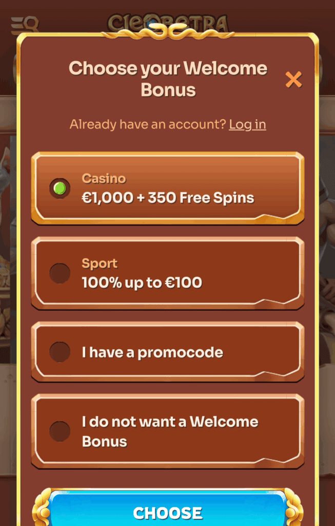 Za začetek igranja na Cleobetra Casino je treba ustvariti uporabniški račun. Postopek vključuje pet osnovnih korakov, med katerimi boste vnesli svoje podatke, izbrali bonus ter nastavili prijavne podatke. Spodaj je razčlenjen vsak korak posebej.