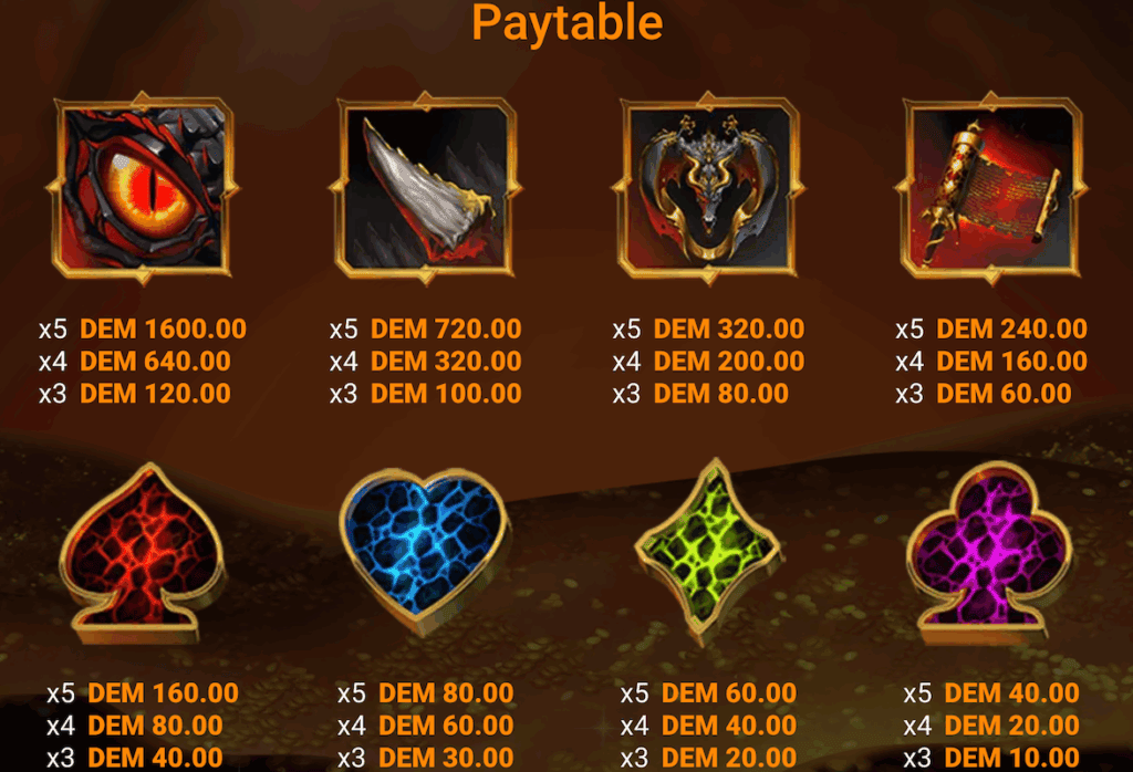 Igralni avtomat Draco’s Gold ponuja preprosto igralno izkušnjo, saj ima 5 kolutov, 3 vrstice in 40 izplačilnih linij. Če se žČe se želite bolje seznaniti z igro, vam priporočamo, da najprej kliknete na gumb za informacije v spodnjem levem kotu. Tam boste našli ključne podrobnosti o tej casino igre, vključno s tabelo izplačil, ki prikazuje vrednosti posameznih simbolov in pojasnjuje posebne funkcije, kot sta Wild in Scatter simbol.