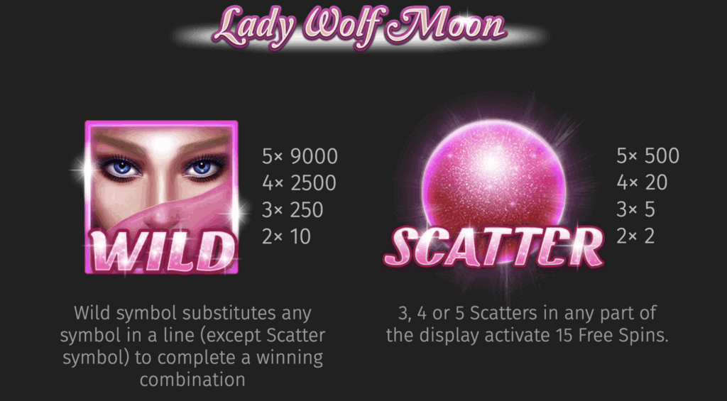 Posebno vlogo igrata Wild in Scatter simbol. Wild simbol (lady) nadomešča vse druge simbole, razen Scatterja, ter hkrati podvoji dobitke. Scatter simbol (mesec) prinaša takojšnje nagrade in sproži brezplačne vrtljaje, medtem ko volk velja za najvrednejši simbol, saj prinaša najvišja izplačila igralcem, ki ga uspejo sestaviti v zmagovalnih kombinacijah.