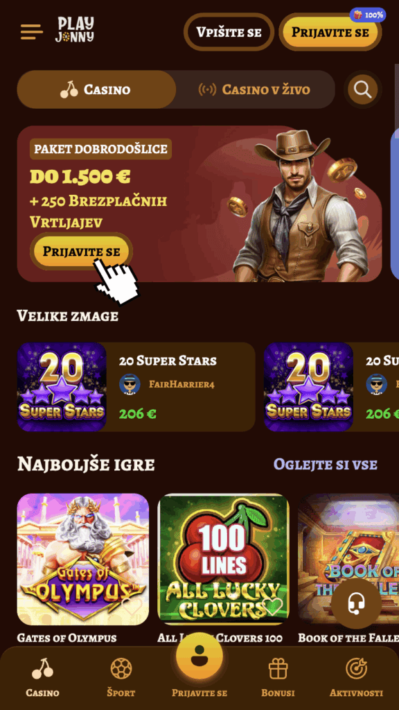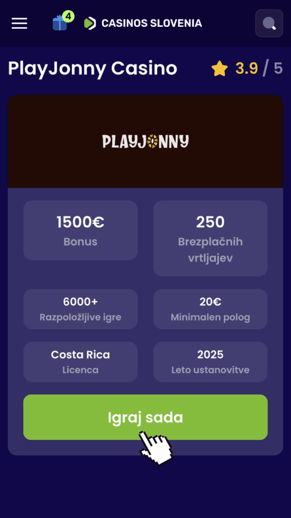 Ali ima Playjonny Casino fizično lokacijo v Sloveniji za igranje slotov in drugih casino iger?Ne. Vse igre so na voljo izključno prek njihove spletne platforme.