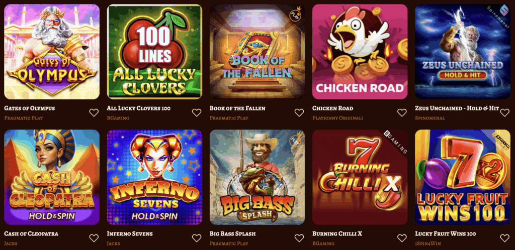 Playjonny Casino ponuja več kot 6000 iger, ki jih poganja kar 69 različnih ponudnikov programske opreme. Med najbolj znanimi so Pragmatic Play, NetEnt, BGaming, Spinomenal in Endorphina, kar zagotavlja raznoliko in kakovostno igralno izkušnjo.